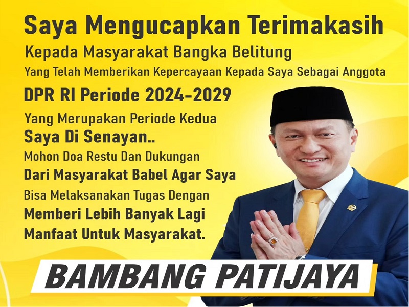 Terima kasih kepada Masyarakat Bangka Belitung (Babel) yang sudah mempercayai saya mewakili Babel untuk kedua kalinya di Senayan, pada periode 2024-2029 ini. Mudah-mudahan saya tetap dapat berkontribusi dan memberikan manfaat buat masyarakat Babel dari jalur Legislatif di pusat.
